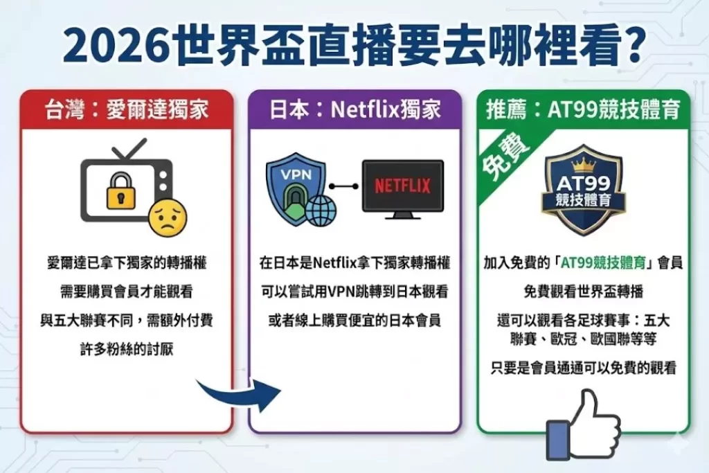 台灣是愛爾達拿到轉播權,但是在日本可是Netflix拿下獨家轉播權,所以這裡大家可以嘗試用VPN跳轉到日本進行觀看,又或者可以線上購買便宜的日本會員,就可以直接進行觀看,如果切換你的網路位置無法進行觀看,沒關係下面還有一個免費的世界盃轉播平台要推薦給你。