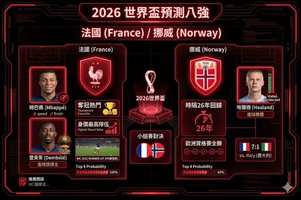 你可能感興趣:【2026世界盃八強預測】懶人包!法國有望突破八強拿下世足冠軍?