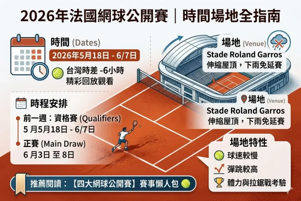 2026法國網球公開賽的時間是2026年5月18日至6月7日進行,在2026法國網球公開賽開始前一周則會是資格賽,這裡比賽的地點就位於法國巴黎的Stade Roland Garros進行,這場地可以說非常屌,有伸縮的屋頂可以調整,就算下雨也不用擔心會遇到延賽的問題。