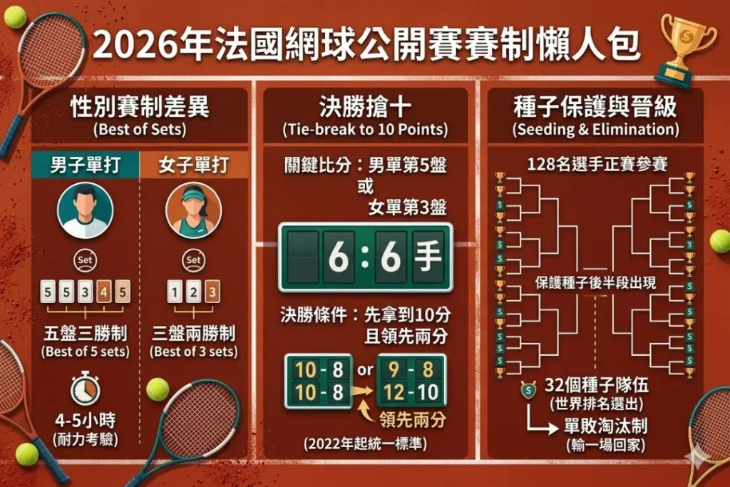 2026法國網球公開賽會因為選手性別有所不同,舉例來說在男子單打的賽制就是五盤三勝的制度,而女子單打則會視三盤兩勝制,主要還是因為男生的體力本身就較佳,所以才會有這樣的限制,尤其是男生選手打到決勝盤通常比賽都會到4~5小時之久,非常考驗選手們的耐力。