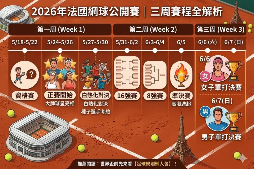 2026法國網球公開賽一共進行三周的賽事,從5/18日開始進行該賽事,然後將會在6/6日進行女子單打決賽,然後6/7日則是男子單打的決賽,這一點大家可千萬不要錯過,因為賽事時間絕對是2026法國網球公開賽最久的絕對讓你值回票價,三周的2026法國網球公開賽賽程。